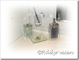 Vi har beholdt baderomsinnredningen, men byttet ut den hvite benkeplaten og nedfellbare vasken med heldekkende vask i støpemarmor. Blandebatteri til håndvasken og dusjen er også byttet ut. Også har vi kjøpt nytt speil siden det gamle var blitt “slitt” i nederkant. Fargene som nå er valgt er lys grå, hvitt og sølv. Tekstilene er i mørk lilla.